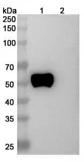Western blot analysis was performed using anti-RAGE/AGER monoclonal antibody at 1ug/mL on various samples.Lane 1:recombinant human RAGE/AGER (Catalog No.:TD-HS925021)Lane 2:negative control