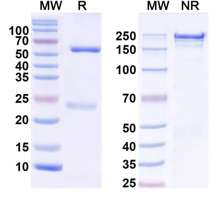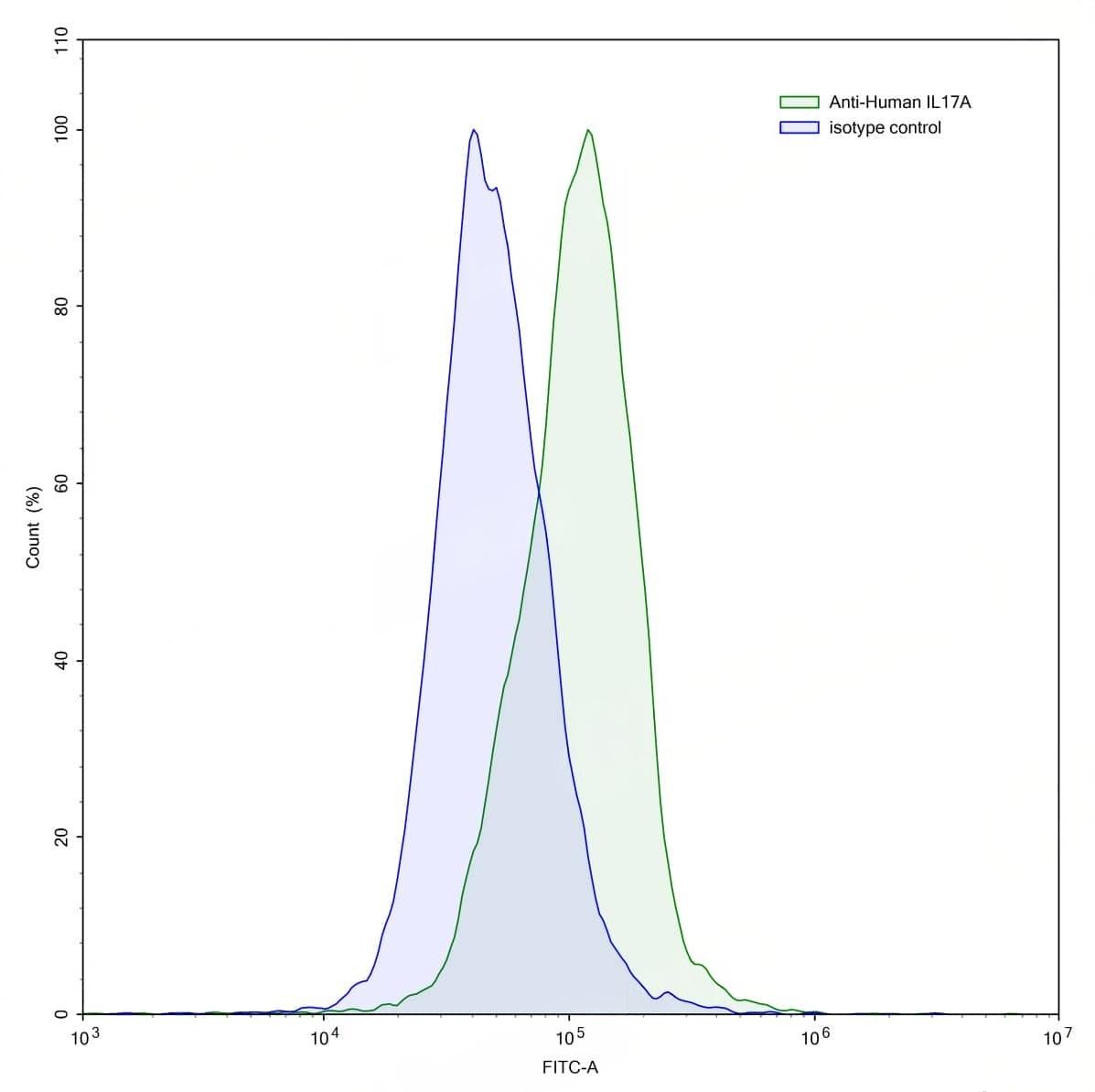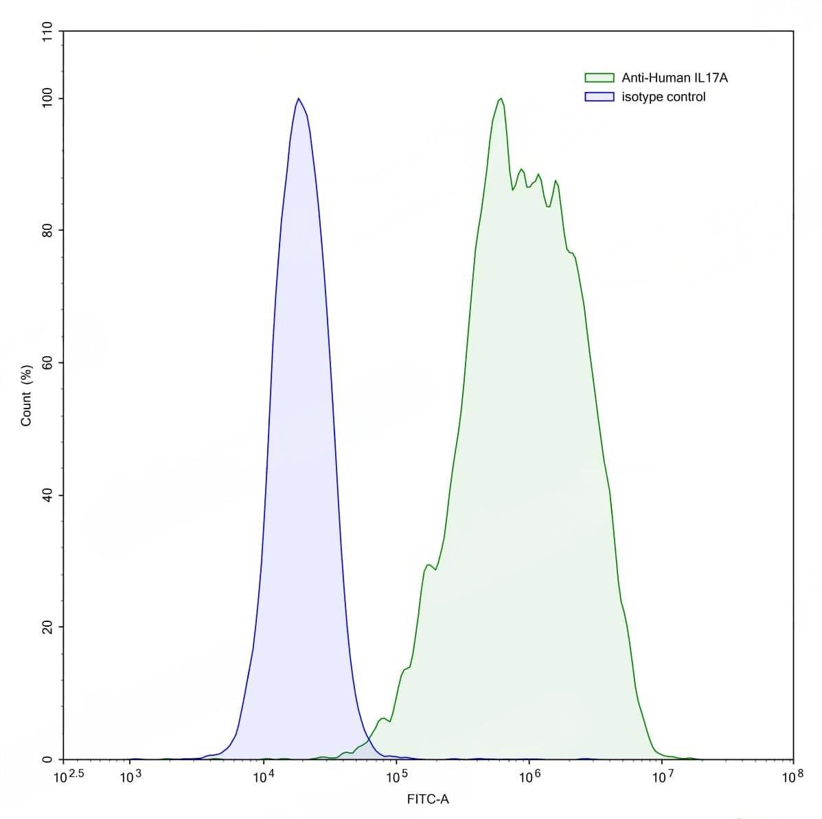 SEC-HPLC detection for InVivoMAb Anti-Human IL17A (ABV0017). | Flow-cytometry using anti-human IL17A antibody.IL17A Transfected CHO cells were stained with an irrelevant antibody (Blue Histogram) or an anti-human IL17A antibody monoclonal antibody (Catalog No.:TD-HS856010 ,Green Histogram) at a concentration of 5 µg/ml for 30 mins at RT. After washing, bound antibody was detected using a FITC conjugated goat anti-human antibody (Catalog No.:TD-HF690414) and cells analysed on a NovoCyte Flow Cytometer.,Flow-cytometry using anti-human IL17A antibody.Human Jurkat cell line were stained with an irrelevant antibody (Blue Histogram) or an anti-human IL17A antibody monoclonal antibody (Catalog No.:TD-HS856010 ,Green Histogram) at a concentration of 5 µg/ml for 30 mins at RT. After washing, bound antibody was detected using a FITC conjugated goat anti-human antibody (Catalog No.:TD-HF690414) and cells analysed on a NovoCyte Flow Cytometer. | SDS-PAGE for InVivoMAb Anti-Human IL17A (Iv0029).