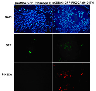 Immunofluorescence of cells expressing PIK3CA proteins with Anti-PIK3CA(H1047Y) antibody. HEK293T cells were transfected with pCDNA3-GFP-PIK3CA (WT) plasmid (left column) or pCDNA3-GFP-PIK3CA(H1047Y) plasmid (right column), then fixed and stained with Anti-PIK3CA(H1047Y) monoclonal antibody (Cat. #TD-26216). |