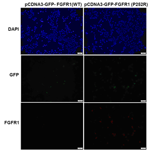 Immunofluorescence of cells expressing FGFR1 proteins with Anti-FGFR1(P252R) antibody. HEK293T cells were transfected with pCDNA3-GFP-FGFR1 (WT) plasmid (left column) or pCDNA3-GFP-FGFR1(P252R) plasmid (right column), then fixed and stained with Anti-FGFR1(P252R) monoclonal antibody (Cat. #TD-26249). |