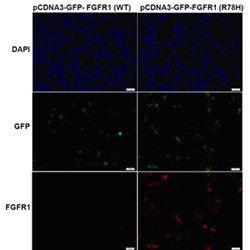 Immunofluorescence of cells expressing FGFR1 proteins with Anti-FGFR1(R78H) antibody. HEK293T cells were transfected with pCDNA3-GFP-FGFR1 (WT) plasmid (left column) or pCDNA3-GFP-FGFR1(R78H) plasmid (right column), then fixed and stained with Anti-FGFR1(R78H) monoclonal antibody (Cat. #TD-26251).