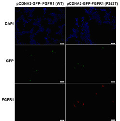 Immunofluorescence of cells expressing FGFR1 proteins with Anti-FGFR1(P252T) antibody. HEK293T cells were transfected with pCDNA3-GFP-FGFR1 (WT) plasmid (left column) or pCDNA3-GFP-FGFR1(P252T) plasmid (right column), then fixed and stained with Anti-FGFR1(P252T) monoclonal antibody (Cat. #TD-26253).