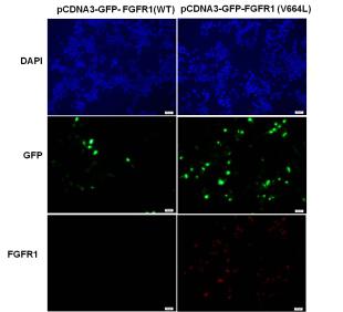 Immunofluorescence of cells expressing FGFR1 proteins with Anti-FGFR1(V664L) antibody.HEK293T cells were transfected with pCDNA3-GFP-FGFR1 (WT) plasmid (left column) or pCDNA3-GFP-FGFR1(V664L) plasmid (right column), then fixed and stained with Anti-FGFR1(V664L) monoclonal antibody (Cat. #TD-26259).