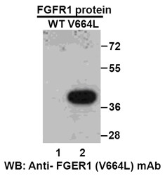 Western blot analysis of recombinant FGFR1(V664L) and wild type proteins.Purified His-tagged FGFR1(V664L) protein (478-767aa, 38KD, lane 2,) and corresponding wild type protein (lane 1) were blotted with Anti-FGFR1(V664L) monoclonal antibody (Cat. #TD-26259).