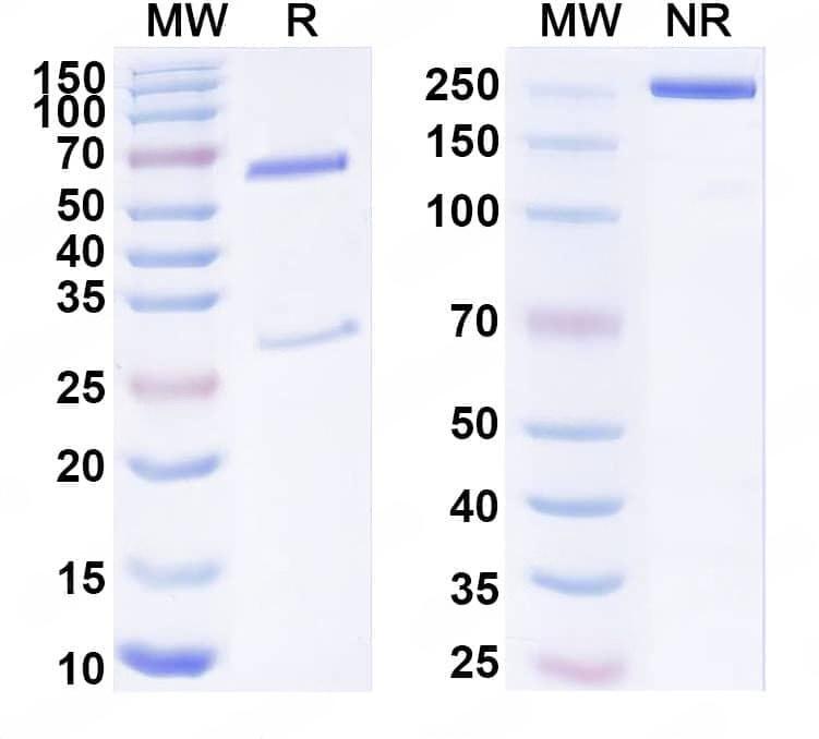 Flow-cytometry using anti-human TSLPR antibody.Human peripheral blood lymphocytes were stained with an irrelevant antibody (Blue Histogram) or an anti-human TSLPR antibody monoclonal antibody (Catalog No.:TD-HP521013 ,Green Histogram) at a concentration of 5 µg/ml for 30 mins at RT. After washing, bound antibody was detected using a FITC conjugated goat anti-mouse antibody (Catalog No.:TD-MF690414) and cells analysed on a NovoCyte Flow Cytometer. | SDS-PAGE for Anti-Human TSLPR/CRLF2 Antibody (13H5).