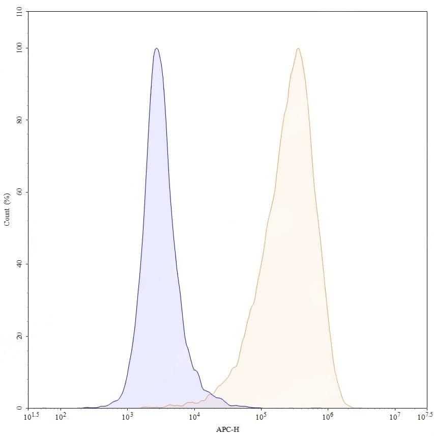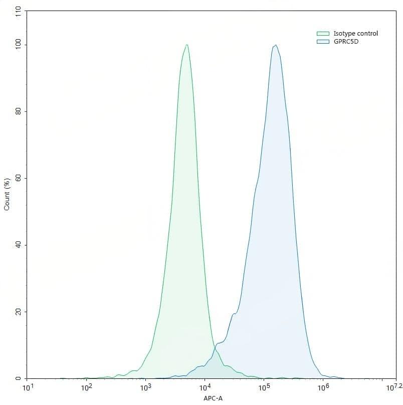 Flow-cytometry using anti-Human GPRC5D antibody. GPRC5D Transfected 293T cells were stained with an irrelevant antibody (Green Histogram) or an anti-Human GPRC5D antibody monoclonal antibody (Catalog No.:TD-HP458013, Blue Histogram) at a concentration of 5 µg/ml for 30 mins at RT. After washing, bound antibody was detected using a APC- conjugated goat anti-mouse antibody and cells analysed on a NovoCyte Flow Cytometer. | SDS-PAGE for Anti-Human GPRC5D Antibody (SAA0764). | Flow-cytometry using anti-human GPRC5D antibody. Untransfected cells (blue Histogram) and Transfected cells (Yellow Histogram) were stained with an anti-human GPRC5D monoclonal antibody (Catalog No.:TD-HP458013) at a concentration of 5 µg/ml for 30 mins at RT. After washing, bound antibody was detected using a Goat Anti-Mouse IgG H&L Polyclonal Antibody, FITC (Catalog No.:TD-MF690414) and cells analysed on a NovoCyte Flow Cytometer.