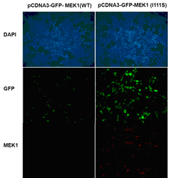 Immunofluorescence of cells expressing MEK1 proteins with Anti-MEK1(I111S) antibody. HEK293T cells were transfected with pCDNA3-GFP-MEK1 (WT) plasmid (left column) or pCDNA3-GFP-MEK1 (I111S) plasmid (right column), then fixed and stained with Anti-MEK1(I111S) monoclonal antibody (Cat. #TD-26264). |