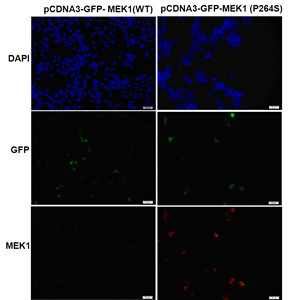 Immunofluorescence of cells expressing MEK1 proteins with Anti-MEK1(P264S) antibody. HEK293T cells were transfected with pCDNA3-GFP-MEK1 (WT) plasmid (left column) or pCDNA3-GFP-MEK1(P264S) plasmid (right column), then fixed and stained with Anti-MEK1(P264S) monoclonal antibody (Cat. #TD-26266). |