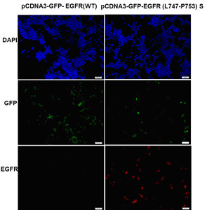Immunofluorescence of cells expressing EGFR proteins with anti-EGFR(L747-P753)S antibody.HEK293T cells were transfected with pCDNA3-GFP-EGFR (WT) plasmid (left column) or pCDNA3-GFP-EGFR(L747-P753)S plasmid (right column), then fixed and stained with anti- EGFR(L747-P753)S monoclonal antibody (Cat. #TD-26287).