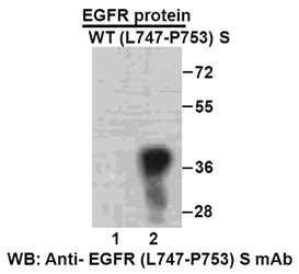 Western blot analysis of recombinant EGFR(L747-P753) S and wild type proteins.Purified His-tagged EGFR(L747-P753)S protein (702-987) and wild type protein (702-987) were blotted with anti- EGFR(L747-P753)S mouse antibody (Cat. #TD-26287).
