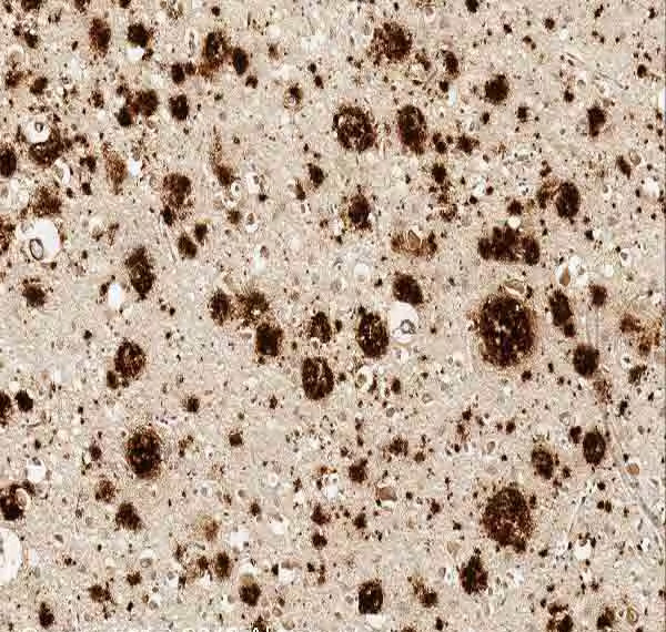 Dot Blot: Human beta Amyloid (Aß) 1-42. IHC-P: FFPE Human Brain Alzheimer. IHC-Free floating: Mouse brain |