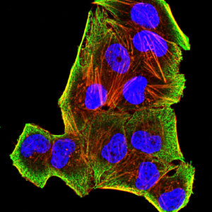 Immunofluorescence analysis of Hela cells using CD273 mouse mAb (green). Blue: DRAQ5 fluorescent DNA dye. Red: Actin filaments have been labeled with Alexa Fluor- 555 phalloidin. Secondary antibody from Fisher (Cat#: 35503)