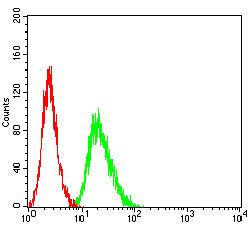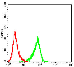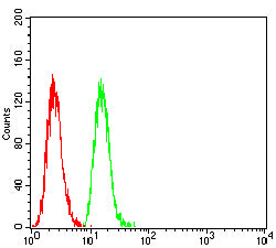 Flow cytometric analysis of K562 cells using CD273 mouse mAb (green) and negative control (red).