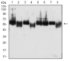 Western blot analysis using CD273 mouse mAb against HepG2 (1), Hela (2),NIH/3T3 (3),PC-12 (4),K562 (5),Jurkat (6),MCF-7 (7), and HEK293-6e (8) cell lysate.