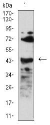 Western blot analysis using CD268 mouse mAb against C6 (1) cell lysate.