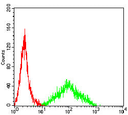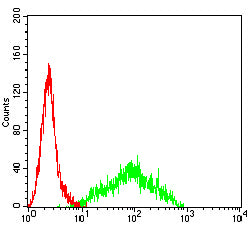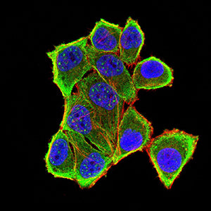 Immunofluorescence analysis of Hela cells using CD220 mouse mAb (green). Blue: DRAQ5 fluorescent DNA dye. Red: Actin filaments have been labeled with Alexa Fluor- 555 phalloidin. Secondary antibody from Fisher (Cat#: 35503)