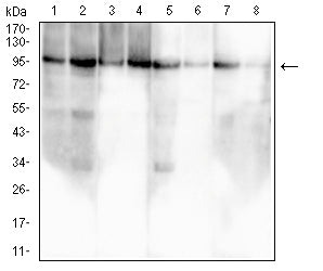 Western blot analysis using CD220 mouse mAb against HepG2 (1), HEK293 (2), Jurkat (3), Hela (4), THP-1 (5), NIH/3T3 (6), COS7 (7), and PC-3 (8) cell lysate.