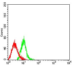 Flow cytometric analysis of HL-60 cells using CD208 mouse mAb (green) and negative control (red).