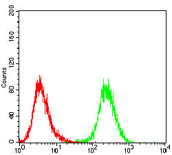 Flow cytometric analysis of MOLT4 cells using CD206 mouse mAb (green) and negative control (red).