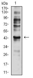 Western blot analysis using CD197 mouse mAb against C6 (1) cell lysate.