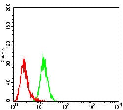 Flow cytometric analysis of HL-60 cells using CD195 mouse mAb (green) and negative control (red).