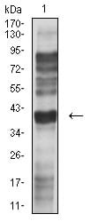 Western blot analysis using CD195 mouse mAb against L-02 (1) cell lysate.
