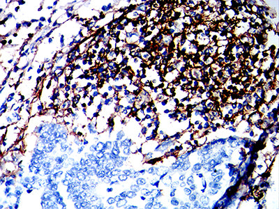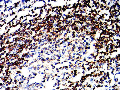 Immunofluorescence analysis of Hela cells using CD180 mouse mAb (green). Blue: DRAQ5 fluorescent DNA dye. Red: Actin filaments have been labeled with Alexa Fluor- 555 phalloidin. Secondary antibody from Fisher (Cat#: 35503)