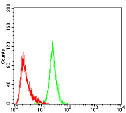 Flow cytometric analysis of THP-1 cells using CD180 mouse mAb (green) and negative control (red).