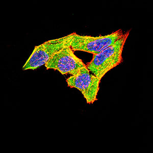 Immunofluorescence analysis of Hela cells using CD178 mouse mAb (green). Blue: DRAQ5 fluorescent DNA dye. Red: Actin filaments have been labeled with Alexa Fluor- 555 phalloidin. Secondary antibody from Fisher (Cat#: 35503)