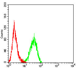 Flow cytometric analysis of K562 cells using CD172b mouse mAb (green) and negative control (red).