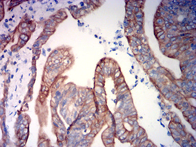 Immunofluorescence analysis of Hela cells using CD172b mouse mAb (green). Blue: DRAQ5 fluorescent DNA dye. Red: Actin filaments have been labeled with Alexa Fluor- 555 phalloidin. Secondary antibody from Fisher (Cat#: 35503)