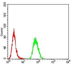 Flow cytometric analysis of Hela cells using CD168 mouse mAb (green) and negative control (red).