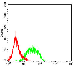 Flow cytometric analysis of Jurkat cells using CD160 mouse mAb (green) and negative control (red).