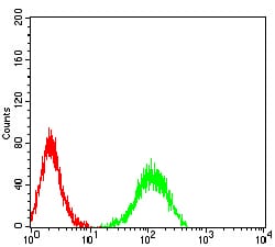 Flow cytometric analysis of HL-60 cells using CD156 mouse mAb (green) and negative control (red).