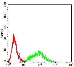 Flow cytometric analysis of HL-60 cells using CD141 mouse mAb (green) and negative control (red).