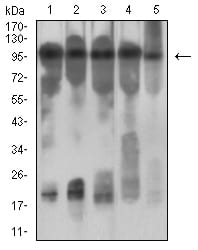 Western blot analysis using CD131 mouse mAb against NIH/3T3 (1), Hela (2), C6 (3),A549(4) and MCF-7 (5) cell lysate.