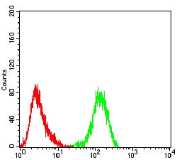 Flow cytometric analysis of Hela cells using CD131 mouse mAb (green) and negative control (red).