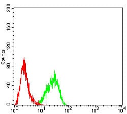 Flow cytometric analysis of HL-60 cells using CD122 mouse mAb (green) and negative control (red).