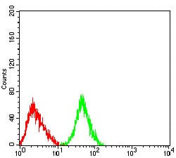 Flow cytometric analysis of Jurkat cells using CD122 mouse mAb (green) and negative control (red).