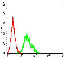Flow cytometric analysis of THP-1 cells using CD121B mouse mAb (green) and negative control (red).