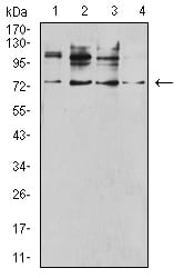 Western blot analysis using CD120B mouse mAb against SK-BR-3 (1), C2C12 (2), MOLT4 (3), and T47D (4) cell lysate.