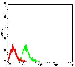 Flow cytometric analysis of Jurkat cells using CD109 mouse mAb (green) and negative control (red).