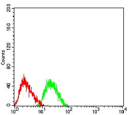 Flow cytometric analysis of Jurkat cells using CD107b mouse mAb (green) and negative control (red).