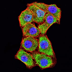 Immunofluorescence analysis of Hela cells using CD106 mouse mAb (green). Blue: DRAQ5 fluorescent DNA dye. Red: Actin filaments have been labeled with Alexa Fluor- 555 phalloidin. Secondary antibody from Fisher (Cat#: 35503)