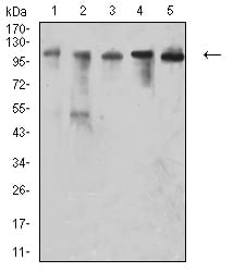 Western blot analysis using CD106 mouse mAb against EC (1), COS7 (2), MCF-7 (3), HepG2 (4), and Hela (5) cell lysate.