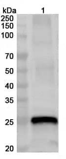 Western blot analysis was performed using anti-RABV-M polyclonal antibody at 1ug/mL on various samples.Lane 1:recombinant RABV M/Matrix protein (Catalog No:TD-VK819012)