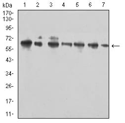 Western blot analysis using CD96 mouse mAb against Hela (1), Jurkat (2), MOLT4 (3), Raji (4), HL-60 (5), U937 (6), and C6 (7) cell lysate.