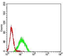 Flow cytometric analysis of K562 cells using CD96 mouse mAb (green) and negative control (red).