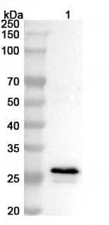 Western blot analysis was performed using anti-MARV VP24/Marburg VP24 polyclonal antibody at 1ug/mL on recombinant MARV VP24/Marburg VP24 (Catalog No.:TD-VK668012).,Western blot analysis was performed using anti-Vp24 polyclonal antibody at 1ug/mL on various samples.Lane 1:recombinant MARV VP24/Marburg VP24 (Catalog No:TD-VK668012)