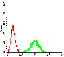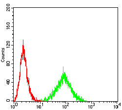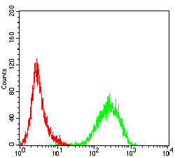 Flow cytometric analysis of THP-1 cells using CD85K mouse mAb (green) and negative control (red).